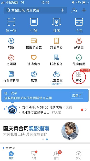 1、 打开支付宝,进入首页,点击“更多”(图1)
