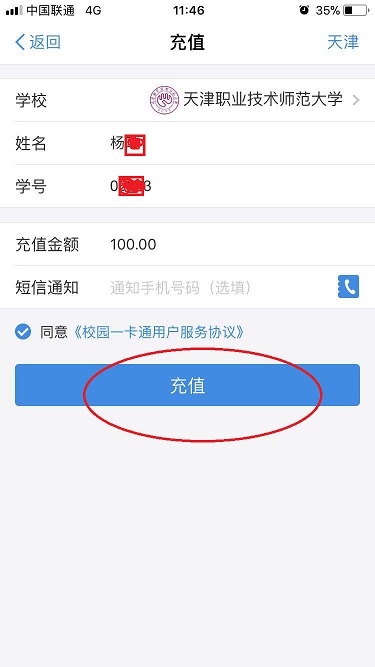 图6:填写“姓名”,学生填写“学号”、教工填写“工号”并点击“充值”
