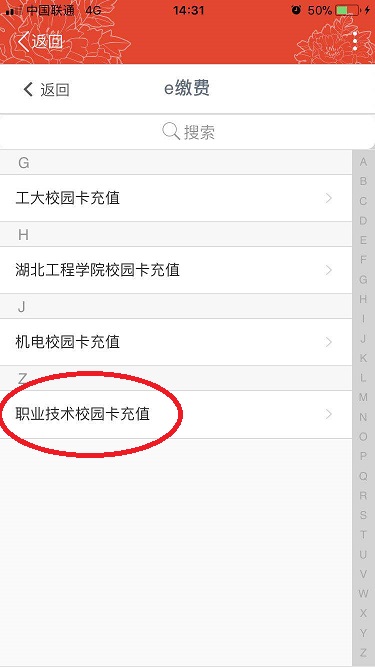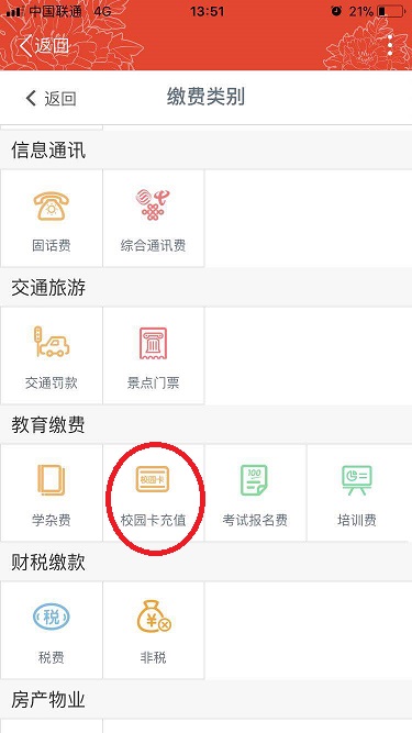 5、在“缴费类别”页面的“教育缴费”下点击“校园卡充值”(图5):