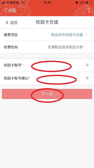 7、在“校园卡充值”页面填写“校园卡账号”、“校园卡账号”确认并点击“下一步”(图8):