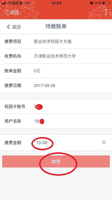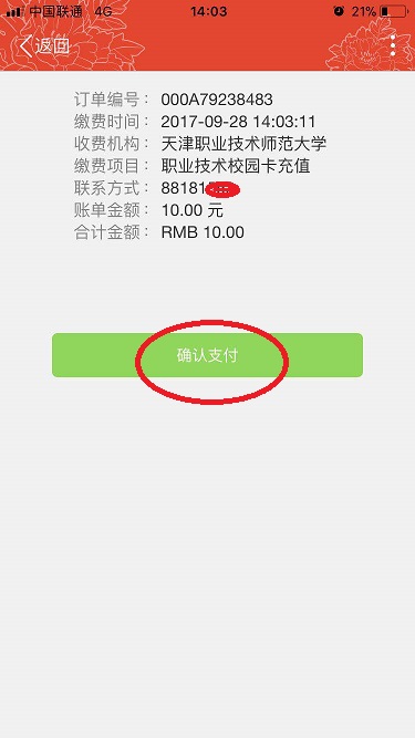 9、在生成的缴费单中点击“确认支付”完成校园卡充值(图10):