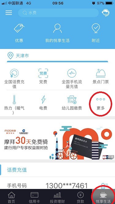 2、在建行手机银行界面点击“悦享生活”,点击“更多”(图2):