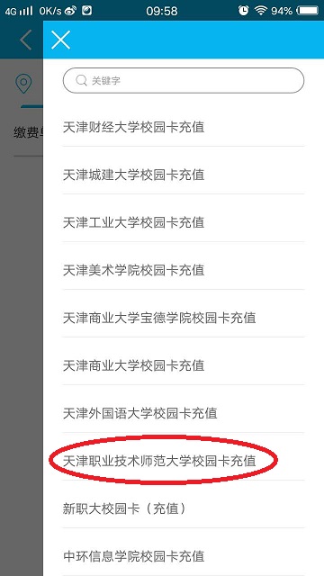 5、在弹出的页面中选择“天津职业技术师范大学校园卡充值”(图5):