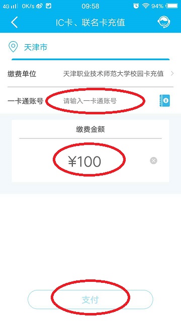 6、在“IC卡、联名卡充值”页面,填写“一卡通账号”、“缴费金额”,然后点击“支付”,根据提示完成充值(图6):